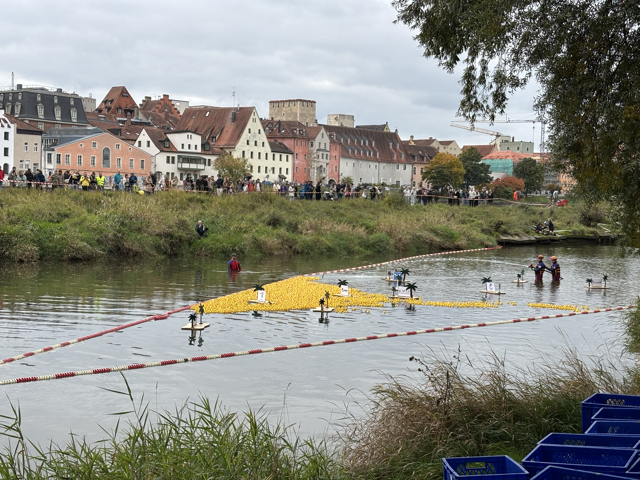 Last weekend, Regensburg hosted a somewhat unusual event: a “duck race.” The organizers threw 6,000 rubber ducks into a shallow canal with virtually still water. The ducks were slowly drifting towards the finish line. How did they make the ducks move in still water? They used high-pressure water streams from hoses to push the water around the ducks towards the finish line. You will be excused for thinking that this is a dumb idea. It does not make for a particularly exciting race. On the other hand, there were people involved who were in the water, so doing that in a shallow canal with still water is safer than doing that in a river with a current. On the plus side, this was the biggest amount of ducks I have ever seen.